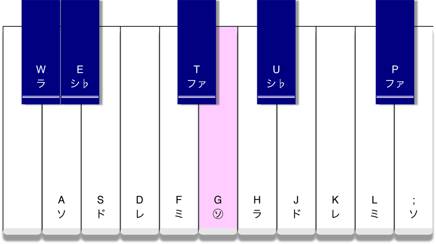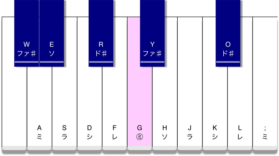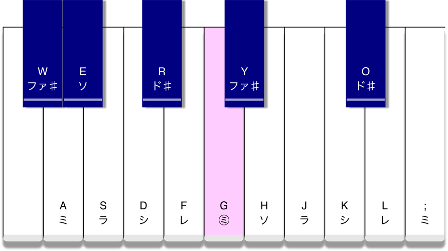 ●キーボードのアルファベットはPCのキーです。PCのキーを押して音を出すこともできます。和音を奏でることもできます。
